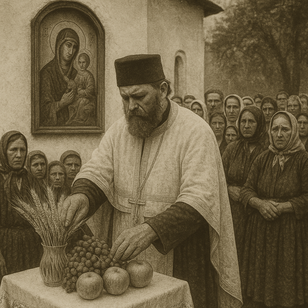În curtea bisericii, preotul așeza înaintea icoanei Maicii Domnului spicele de grâu, strugurii copți și merele roșii, iar rugăciunea rostită acolo se ridica peste sat asemenea unui freamăt cald și binecuvântat. Binecuvântarea roadele pământului și a caselor era văzută ca un moment în care munca oamenilor se unea cu nădejdea în ajutorul lui Dumnezeu și al Maicii Domnului.